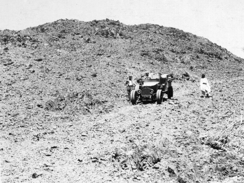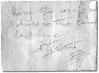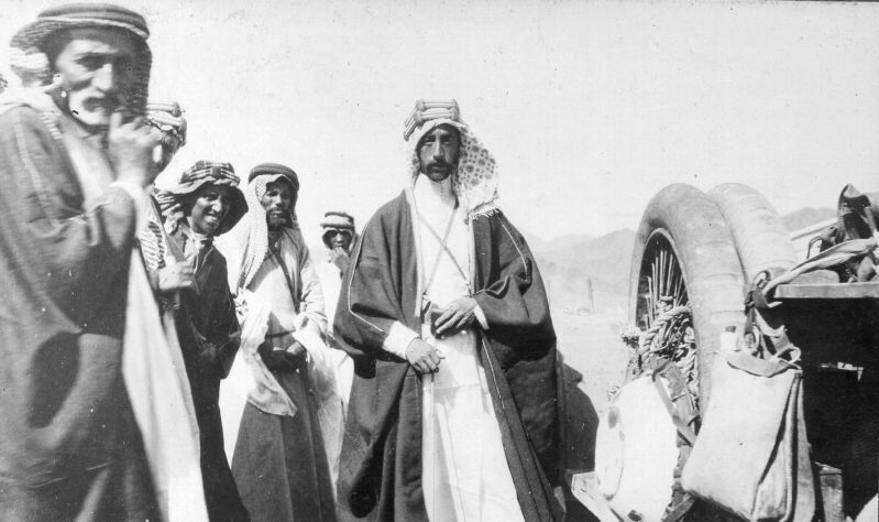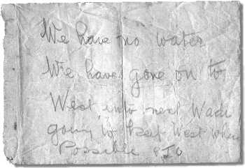 ALMOST A TRAGEDY A reconnaissance party became lost among the "Harreyey" Hills. Owing to the roughness of the country between Wejh and Gayadah a tender and working party left on the 14th to prepare a suitable road for the advance of the Sherfial troops and the Egyptian force. Several rough patches were successfully negotiated and ways clearly marked, making transport for the howitzers and armoured cars possible. A certain R.F.C. officer ( Lieutenant W G Stafford ) in charge of this tender and his working party, 6984 1/AM Porter W., very nearly lost their lives. He and his driver having run short of water owing to losing their way among the mountains were forced to subsist on their own urine to quench their thirsts for two days. They were eventually brought in by Bedouins who found them just in time. Having drank all the available water they had succeeded in running the tender using a mixture of grease and petrol in the radiator for engine cooling. A formal programme to help in such an event was used to help in the search. Lt. Stafford, the officer in charge, left under a stone this note which was discovered later by the search party.