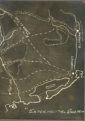 On the 8th June two machines set out from Wejh to test the possibilities of the landing ground at Gayadah. Both machines landed there but one was damaged in getting off. Owing to its altitude the ground was pronounced dangerous as a base for bomb raids, as great difficulty was experienced in getting off. Nevertheless we got the Arabs to increase the ground. They cut down numerous bushes and cleared away large rocks and boulders and eventually made quite a good landing ground about 300 yards square, which was used with success during the bomb raids in July. With the attack on El Ula in view, a machine was sent off on June 12th to photograph El Ula and its defences, using the forward landing ground at Um Jarad as a refilling base. Two machines left El Wejh but owing to the petrol and food cache having been tampered with by the neighbouring tribes near Um Jarad the reconnaissance had to return with its object unfulfilled. On the 17th these were successfully obtained. |