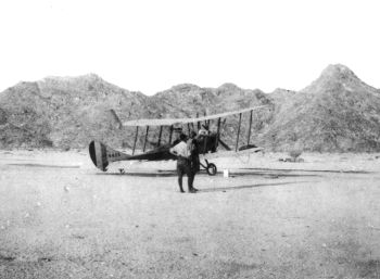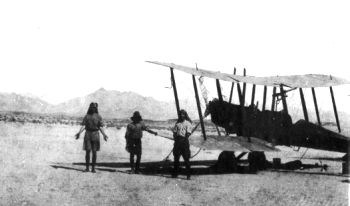 It was therefore deemed advisable if possible to find an advanced landing ground, as at present the railway was out of practical range of our aeroplanes. So on 21st March Major Ross set out from El Wejh on the first ground reconnaissance, by tender, which proved a great success. He succeeded in finding a possible landing ground at Um Jarad in the Wadi Hamdh about 100 miles from El Wejh. While this landing ground was being cleared by Sheikh Ahmed and his followers under Faisal's orders another excellent ground at Baidah or Bide was located and utilised. This ground unfortunately was not close enough to the railway, being only 60 miles N.E. of Wejh. On 30th March two machines reconnoitred the railway near Hadiya, using the new forward landing ground at Um Jarad with success. One pilot during this reconnaissance got lost in a sandstorm on the return flight from the line and eventually came down - through lack of petrol - in the plain near Jebel Raal, where luckily he was found by a search machine the following day. In the first week in April information was received that the Turkish aeroplanes had been moved to Tebuk - a station on the railway about 150 miles N.E. of Wejh. It was also reported that the enemy were advancing on the port of Dhiba, about 100 miles along the coast. On April 9th the landing ground at Um Jarad was used; but as our petrol consignment which was sent out on camels about four days previously had not arrived the proposed bomb raid on the railway had to be abandoned. The heat was now beginning to make itself felt and on this particular flight three engine cylinders were found to be cracked. The cracking of cylinders eventually proved to be a great and consistent cause of trouble during the next few months. An attempt to reconnoitre Muadhdham on the 13th failed owing to this cylinder trouble and with the result that two machines had to remain in the open at the forward landing ground at Baidha for nearly a week. But on the 19th Muadhdham was successfully reconnoitred. The previous day Colonel Newcombe attacked Muadhdham with a small party of Arabs and succeeded in taking several prisoners. On the 22nd Major Ross handed over the command of the Flight to Captain Stent who had been sent down to relieve him. Again it was fortunate that Captain Stent could speak Arabic which proved most useful. The machines were now beginning to show signs of deterioration. The fabric was soggy from the sun and the wood dry and inclined to crack. Luckily we possessed good mechanics and a very capable technical equipment officer, in Lieutenant Stafford who saw to the general efficiency and reliability of our engines which had long since completed their time. This, with the extraordinary working conditions, made the running of the flight doubly difficult and it was only to the conscientiousness of the N.C.O.s and men that the majority of the flying officers owed their lives, as there were many times when on long flights over mountainous country that an engine failure would have meant probably a fatal result. Here, as at Rabegh, our depot ship, the El Kahira, with its condensing plant produced our drinking water and also sufficient for the Egyptian troops. It is true that at Wejh there were water cisterns, but most of them had been fouled by the Turks prior to the evacuation. It is needless to say that without doubt our troops would have had a very great deal greater percentage of sickness had they been forced to drink from the native wells. It was therefore necessary for the El Kahira to return shortly to Suez for coal for the condensing plant. |