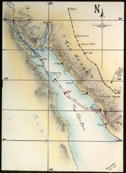 CHANGE OF BASE TO EL WEJH It was intended that the Flight should co-operate with Sherif Ali during this attack but on the 15th orders were received that the R.F.C. had to move immediately to El Wejh - a small port, just recently taken by us, on the coast about 300 miles N. So the following day three machines left by air for El Wejh, following the coast all the way. A stop was made at Yenbo where they spent the night and filled up. The morning after, two machines reached El Wejh and landed at the new Aerodrome which had been prepared by the advanced party. The third machine which had had engine trouble followed on two days later. This change of base also altered the objective. We now aimed at the Hejaz Railway, the enemy's sole line of communication, along which he was very busy bringing in supplies of food and ammunition and at the same time evacuating the civil population. The depot ship, The El Kahira, transported the remainder of the Flight. The sick, mainly typhoid, having been previously evacuated to Port Sudan The country there was found to be more mountainous than that south of Medina towards Rabegh. The main wadi being the Wadi Hamdh, ran approximately S.E. of Wejh to the Railway, which was about 150 miles away.