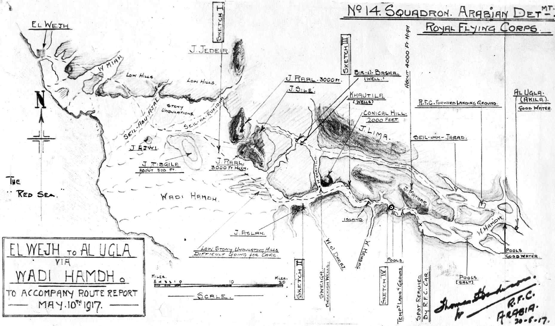 ![]() Right: A ground party reconnaissance in May 1917 to search for and salvage BE2c 4483. Dry brushwood had to be cut back to allow the vehicle to proceed while the temperature was 1180F. Lt W.G. Stafford is on the left and Capt Lawrence seems deep in thought on the right. Below: Recovering the wreck of BE2c 4483 from the Wadi Hamdh. It took this team two days to tow the machine back to their base at Wejh, some 75 miles. |