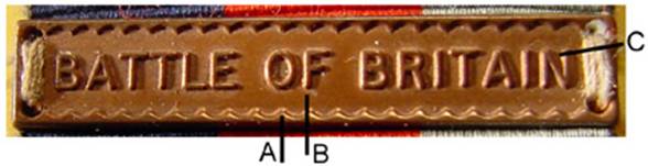 Figure 2. A modern copy Battle of Britain clasp. Note the difference in lettering, the 'O' and the 'A' in particular, and the more cramped letter spacing. Note where the lettering falls in relation to the semi-circles along the edge fringe - the B starts, and the N ends, below a point in the copy (indicated by line from A), but not on the original. The holes on this copy are accurately positioned in the corners and have been drilled, some burring can be felt on the reverse of the clasp. The metal on this one lacks the dull chocolate colour of the original. Hard to see on these images, but the lettering is also deeper on the original.