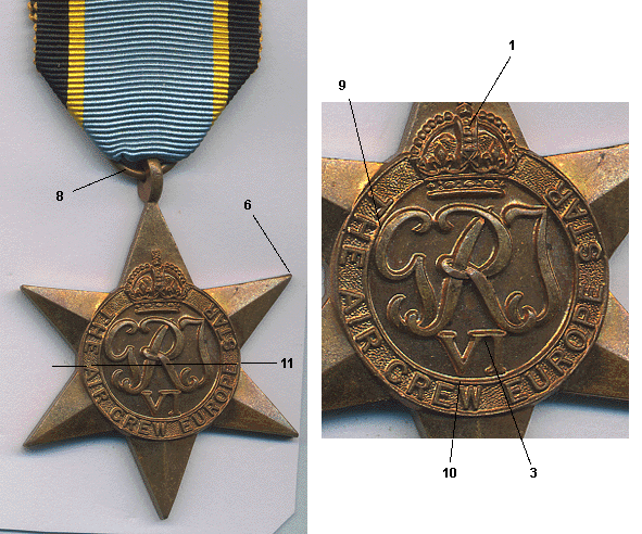 Plate 1, An original Air Crew Europe Star with reference numbers for the pointers listed below.