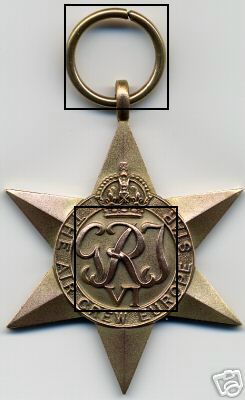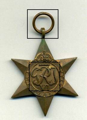 Since the 1970s, WW2 stars have been issued as replacements, or first issues, with a larger suspension ring. This is generally unsoldered and looks too big compared to original post war issues from the 1940s/50s. The stars are, however, genuine and can be separated from the copies in much the same way as suggested above. Thanks to Damien for supplying the following pictures of an excellent example. In the first and second images, the squares are drawn for reference and are the same size within pictures. For the Air Crew Star you can see that the suspension ring is about the same diameter as the inner circle on the star face, for the original issue stars (here an Italy Star for reference), the ring is much smaller and typically narrower than the GRI cypher.